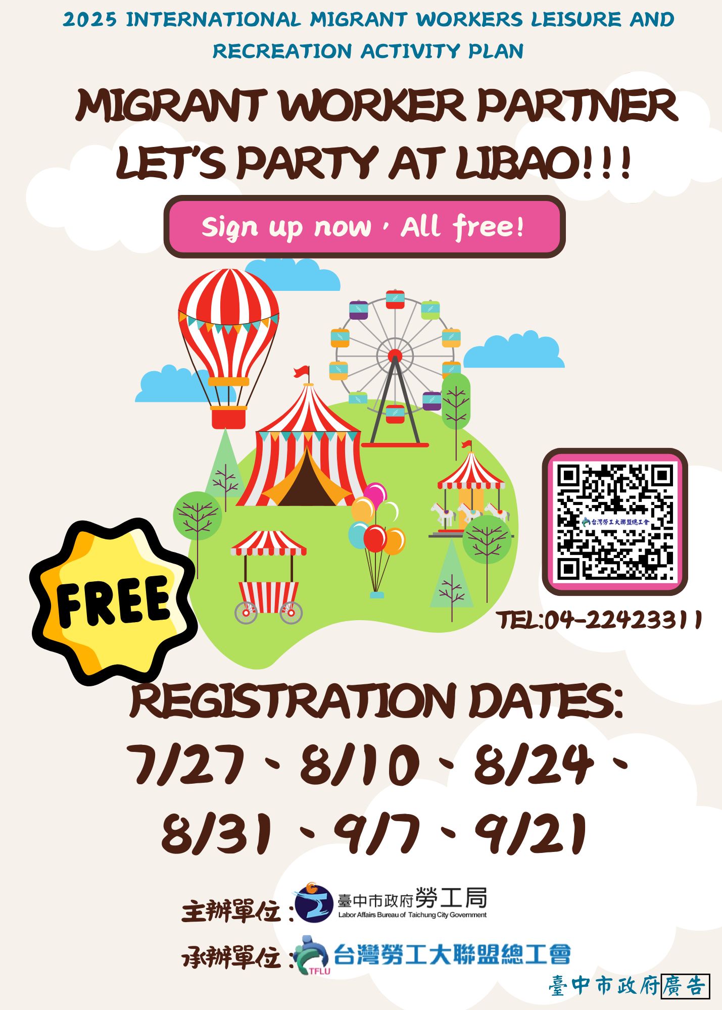 To show care for migrant workers in Taichung and to promote their physical and mental well-being through positive recreational activities, the Taichung City Government’s Labor Affairs Bureau is hosting the International Migrant Worker Leisure and Recreation Activity Plan this year. The first session will kick off on July 27, followed by other sessions on August 10, August 24, August 31, September 7, and September 21. All sessions will take place at Lihpao Resort, a popular destination among international visitors. Registration is available online, and participation is entirely free of charge. All migrant workers currently employed in Taichung, along with their employers and management personnel, are cordially invited to take part in this event.