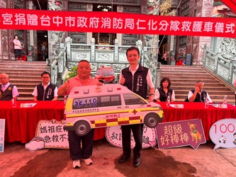 In light of the increasingly demanding emergency medical service operations in Taichung City, and to enhance emergency response capacity for the benefit of Taichung residents, Zhenkun Temple has donated a high-roof ambulance equipped with advanced medical equipment to the Renhua Branch of the Fire Bureau. This act not only demonstrates the religious organization’s concern for public safety but also provides a significant boost to the city’s emergency medical services. The donation ceremony took place on August 4, with Yang Pao-Yi, Chairman of Zhenkun Temple, presenting the vehicle on behalf of the temple, and Deputy Director Yang Yuan-Chi accepting the donation on behalf of the Fire Bureau.