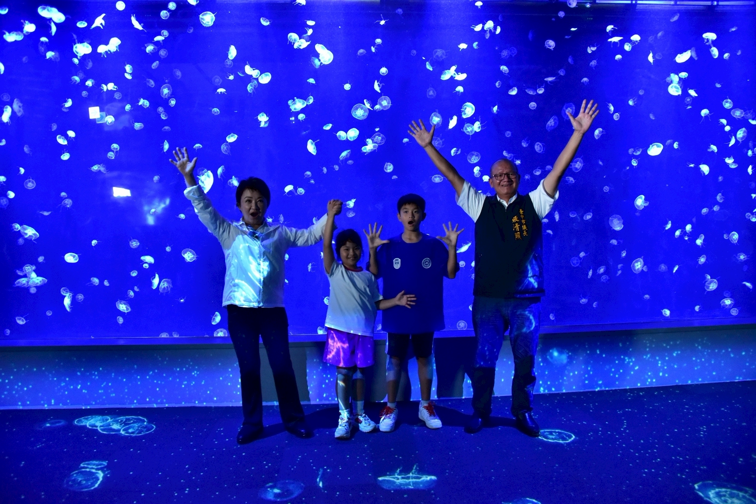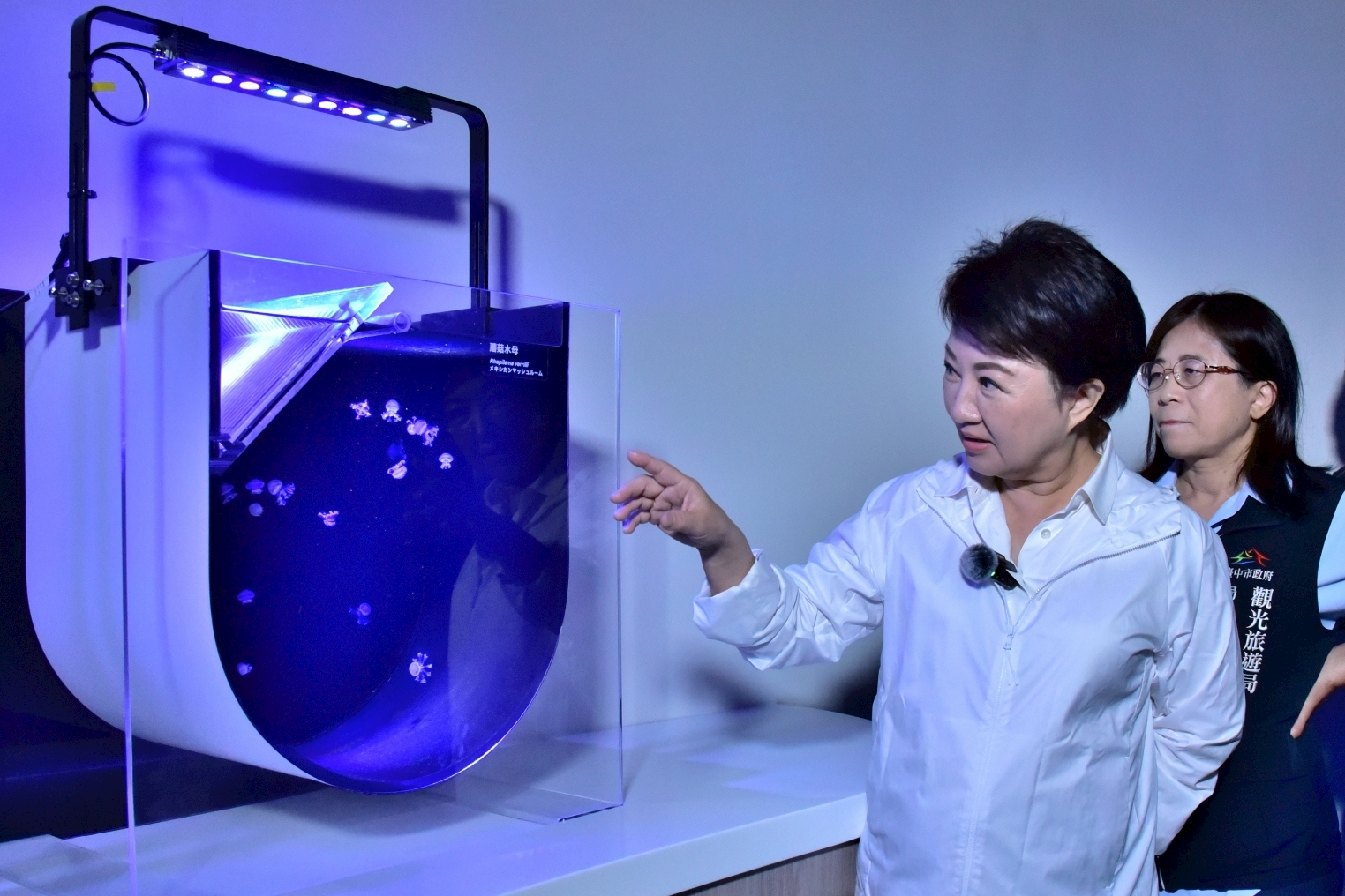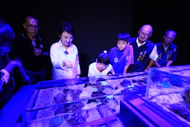 Mayor Lu’s inspection tour began on the third floor at the “Taichung Rivers” exhibition area, which showcases the ecology of the Dajia River basin. While promoting marine education, equal importance is placed on ecological conservation and local connections. She then proceeded to the fourth-floor “Wetlands” exhibition area to experience firsthand Taiwan’s first indoor wetland experience zone and the largest rectangular spotted garden eel display tank. Mayor Lu praised the aquarium's thoughtful integration of education, landscape, and interactive elements. In a moment of playful enthusiasm, she and Council Speaker Chang removed their shoes to step into the indoor wetland experience zone, delightfully exclaiming that children are sure to love it. Returning to the third floor, Mayor Lu also visited the “Jellyfish” exhibition area and the laboratory. Taking on the role of a teacher, she introduced children to Taiwan’s most diverse collection of jellyfish species, all showcased in a richly educational display.