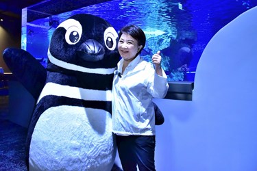 Mayor Lu then proceeded to the second-floor “Penguin” exhibition area, one of the most anticipated features of the Taichung Aquarium. This area is Taiwan’s first-ever open-style penguin exhibit, breaking away from traditional enclosures and offering visitors the immersive experience of being in close proximity to the penguins. Mayor Lu remarked that this type of immersive display is both creative and appealing—not only to children’s liking, but also helping the public better understand the natural habitats of animals and the importance of conservation. She concluded her visit at the first-floor “Kuroshio Sea” and “Marine Academy” exhibition areas, which feature theater-grade immersive projections and a large Pacific Ocean tank displaying marine life in the Pacific Ocean such as sharks and stingrays—highly captivating.