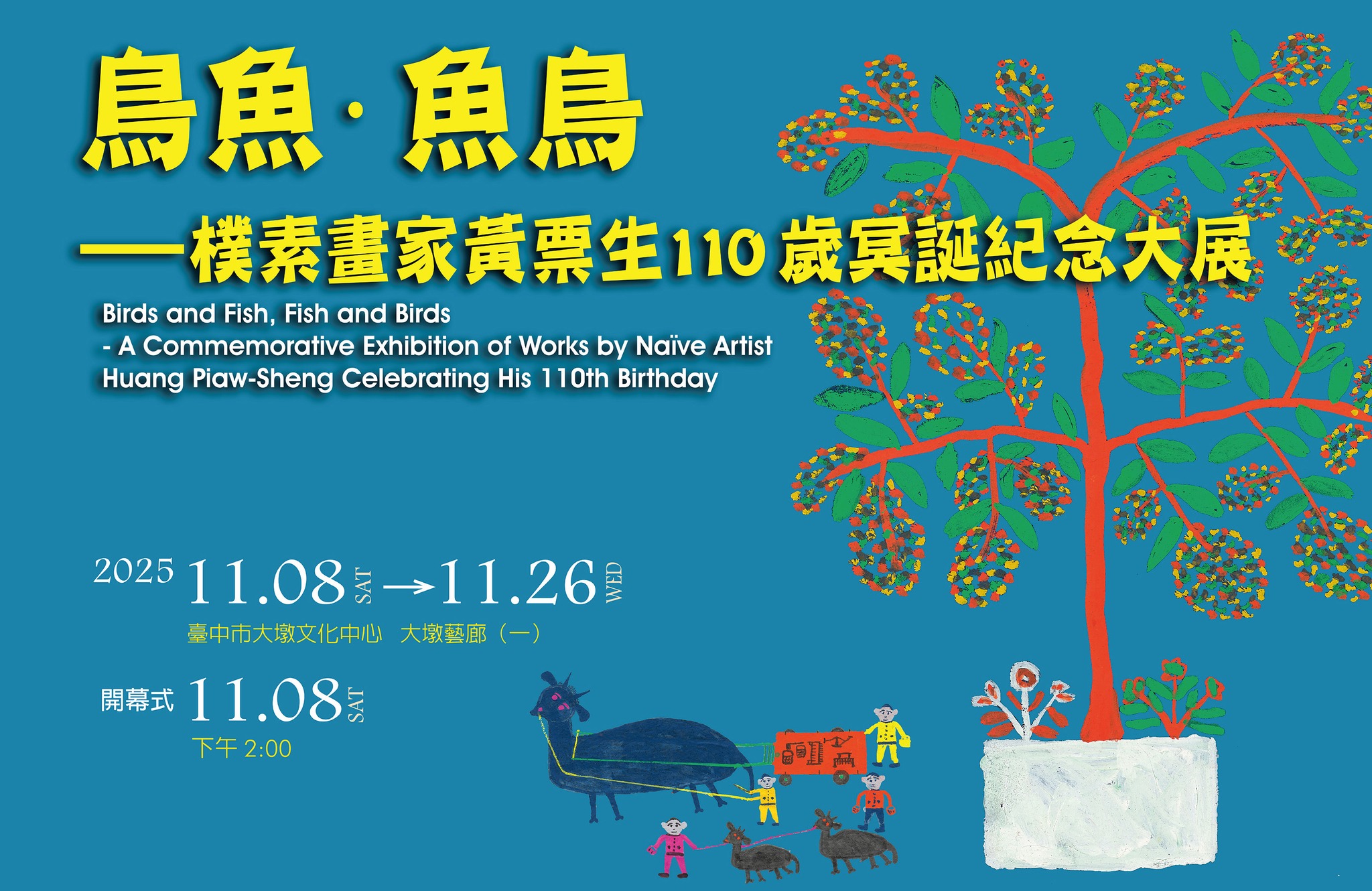 Huang Piaw-Sheng, a painter celebrated for his sincere and unpretentious depictions of everyday life, is honored this year on the 110th anniversary of his birth. To pay tribute to this beloved artist, the Taichung City Government’s Cultural Affairs Bureau has organized a special exhibition, “Birds and Fish, Fish and Birds: The 110th Anniversary Retrospective of Huang Piaw-Sheng,” on view at the Dadun Cultural Center through November 26. At the opening ceremony held yesterday (8th), Deputy Director-General Tseng Neng-Ting of the Cultural Affairs Bureau invited the public to step into the vivid, heartfelt world of this humble master of naïve art.