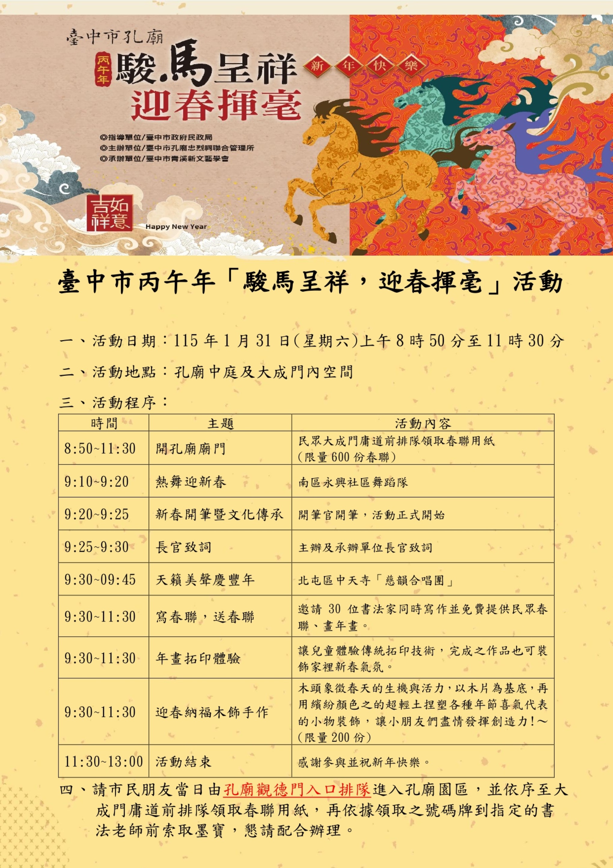 Free Spring Festival Couplets and New Year Prints: Taichung City Confucius Temple’s “Auspicious Horses Present Blessings, Welcoming Spring Calligraphy” to Take Place on January 31