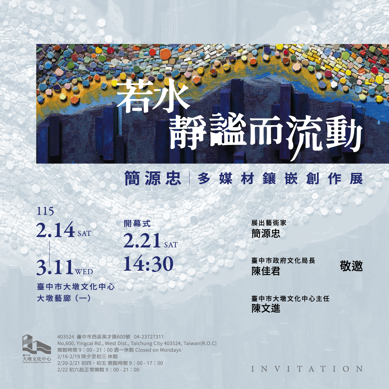 As the Lunar New Year begins, Taichug City Dadun Cultural Center presents a truly “weighty” artistic highlight. Renowned mosaic artist Professor Jian Yuan-Chung unveils Stillness in Flow, a major exhibition showcasing mosaic works that blend exquisite craftsmanship with profound reflections on life. At opening ceremony, Chen Chia-Chun, Director of the Taichung City Government Cultural Affairs Bureau, attended the event, accepted Jian’s donated work “Prayer—Peace and Auspiciousness,” and witnessed the first public unveiling of Jian’s monumental masterpiece “The Mother River—Mayuantou Stream.” Completed over five years using 2.5 million pieces of stone, colored glass, and glazed materials, the large-scale mosaic leaves a quiet yet enduring artistic imprint on the city’s land and sense of time.