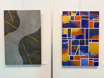 Shu-Min Yuan, director of the Tun District Art Center, stated that this exhibition features approximately 30 two dimensional paintings, fully demonstrating the characteristics of “painting through design thinking.” Geometric lines can serve as the foundation of painting, and through insights gained from long years of design practice, Yeh-Hung Tseng believes that geometric art is deeply compelling. His works not only contain rigorous vertical and horizontal grids, but also incorporate naturally flowing colors and textured brushwork, revealing structures as precise as architecture and vitality as ever changing as the natural world. For example, in “Geometric Radiance,” highly saturated yellow serves as the dominant tone, while rigorously structured lines form a grid that creates a powerful visual impact. In “Ocean Waves,” vertical gray and white blocks are skillfully used to establish order, intersected by golden lines symbolizing light and shadow, and combined with flowing layers of blue and green tones to present a dynamic semi abstract seascape. These works embody the realm in which “design is encountered within painting, and painting is encountered within design,” enabling viewers to experience profound visual beauty and design philosophy through geometric rhythm.