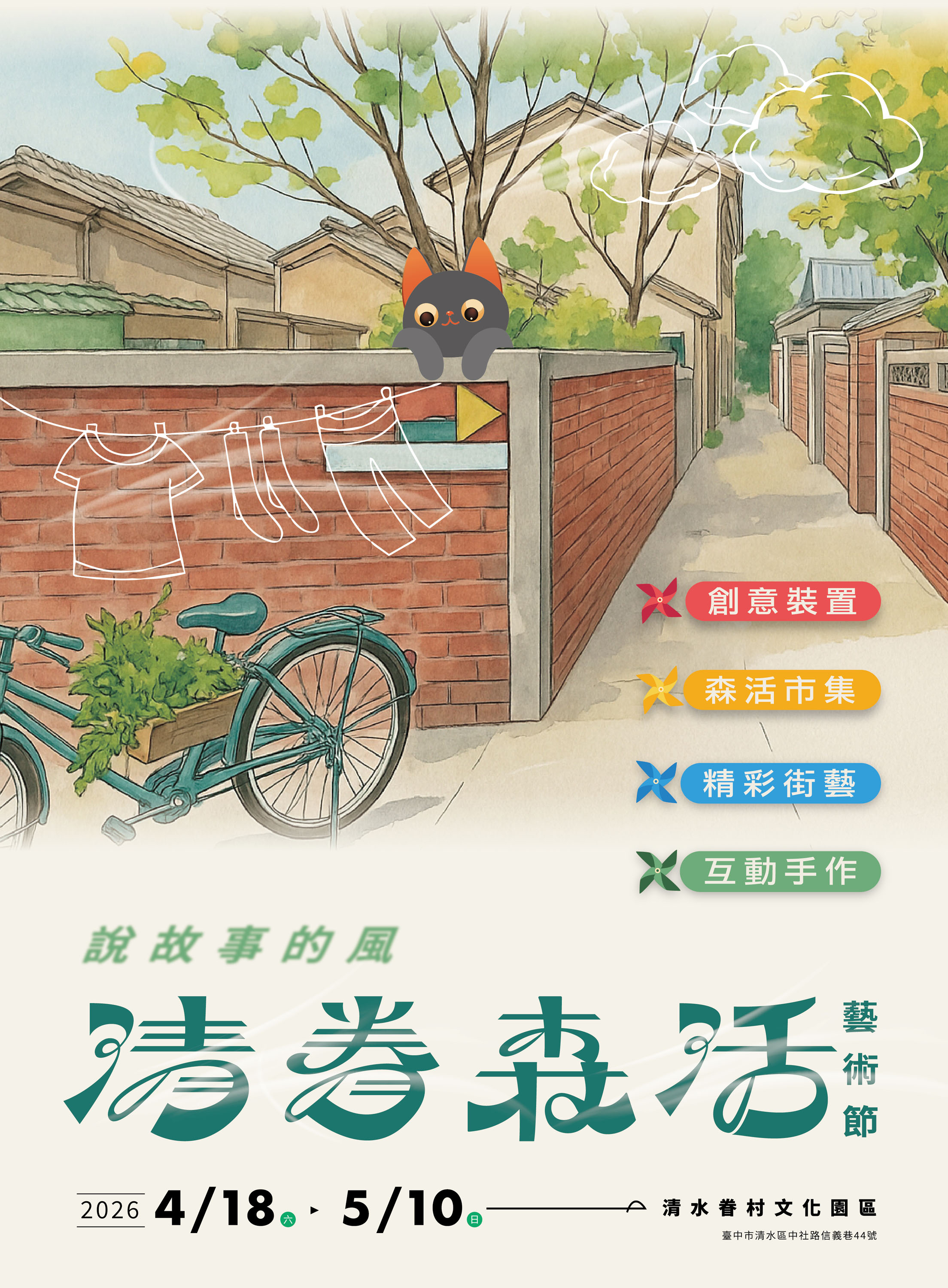 The Cultural Affairs Bureau further explained that one of the annual key events at the Qingshui Military Dependents’ Village Cultural Park, the Qing Military Dependents’ Village Forest Life Arts Festival, is also taking place during the same period. This year’s theme is “The Wind That Tells Stories.” Using the imagery of the wind to connect the park’s characteristic plants, cats, and green landscape, the event features multiple installations that allow visitors to feel the wind and smile, leading them into every corner of the military dependents’ village to discover memories of their own. On April 18 and 19, six street performer groups will also present wonderful performances, along with a themed market and green craft workshops that encourage the public to create practical items from natural and recycled materials. The public is invited to stroll through the lanes of the military dependents’ village amid the spring breeze and artistic atmosphere, and experience another side of military dependents’ village culture.